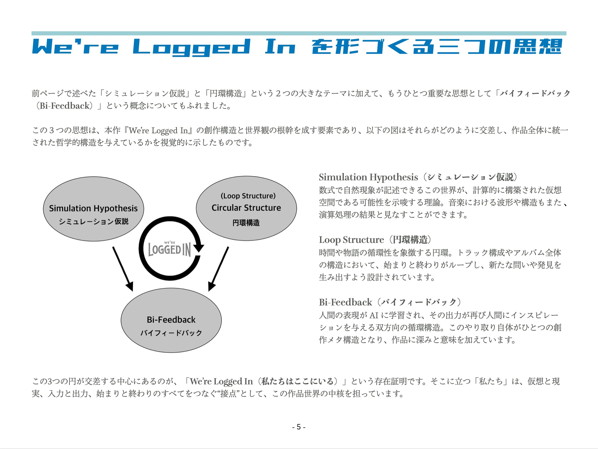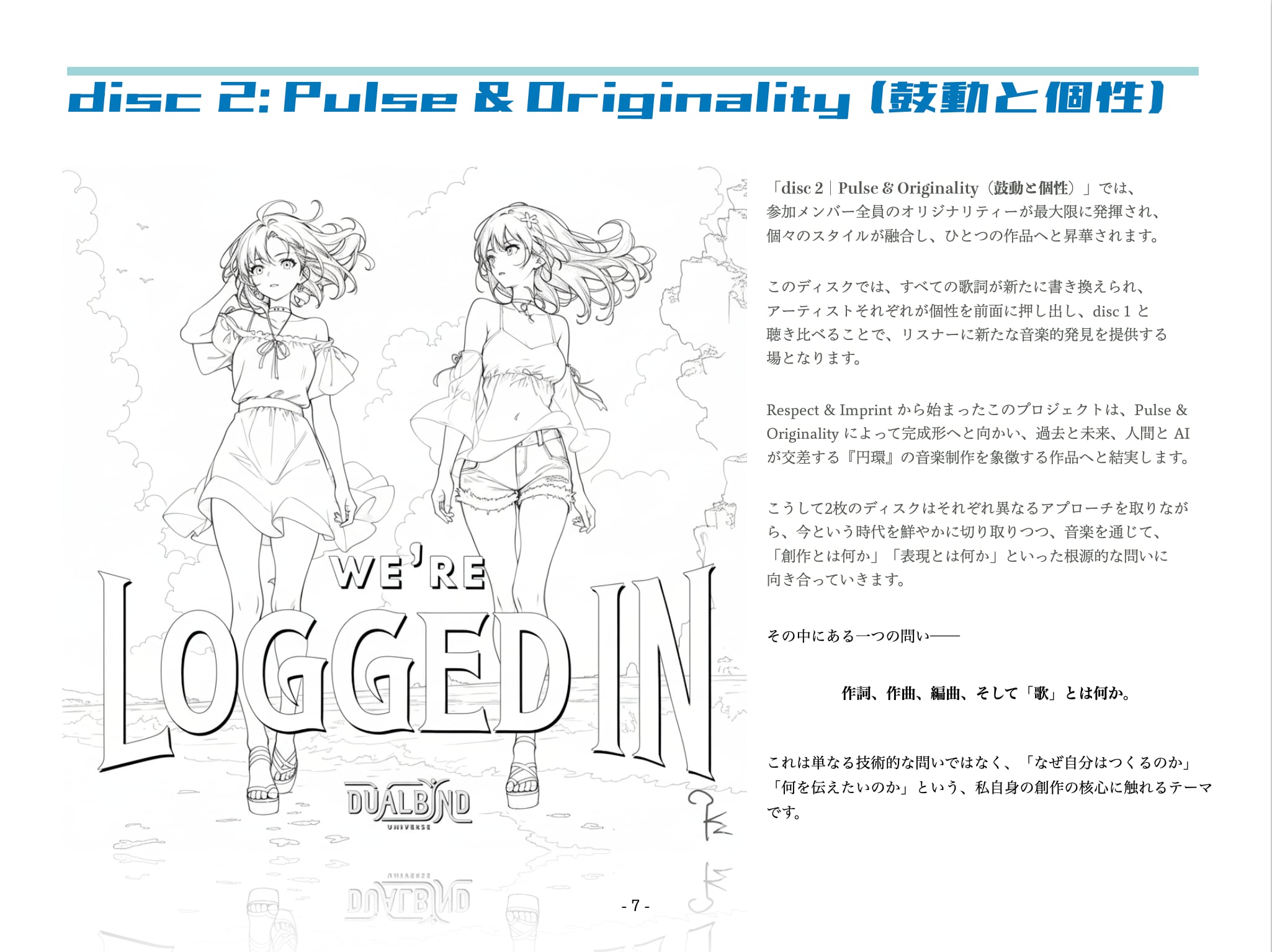 現在制作中のコンセプトアルバム『We’re Logged In(WALI)|私たちはここにいる』のコンセプトブック(pdf)です。本バージョンは、全18ページ予定の 2025 Autumn Ver. で、今後プロジェクトが進むにつれて四半期ごとに内容がバージョンアップして行く予定です。